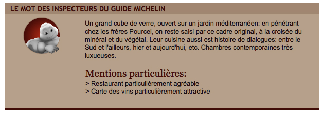 Le Mot de l’inspecteur du guide Michelin, en quelques mots l’établissement est décrit.