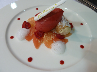 de nougat « touron », quelques framboises fraîches et leur sorbet.