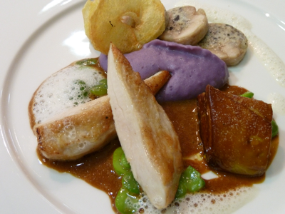 fine purée de pommes vitelotte, quelques févettes, cube de foie gras et jus de rôti.