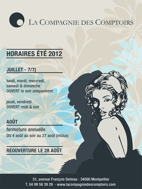 Comme chaque année, le restaurant La Compagnie des Comptoirs vous communique ses dates d’ouverture au mois de juillet et ses dates de fermeture estivale au mois d’août. Durant cette période, vous pourrez bien sûr profiter des trois autres restaurants de la région montpelliéraine à savoir : Le Jardin des Sens à Montpellier, Insensé au Musée Fabre à Montpellier et la plage Carré Mer à Villeneuve-lès-Maguelone.