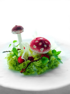Champignons fait en meringue, des « éponges » parfumée au yuzu, pistaches vertes et préparées au micro-ondes. Le tout est accompagné de yogourt au citron, du yuzu, de morceaux de chocolat, de fraises des bois, et d’un sorbet coco. Inspiré d’un des desserts de la carte de El Bulli, créé à l’origine pour lelivre «Nature ».