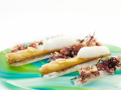 Couteaux grillés et servis avec sauce au gingembre, poivre de Cayenne et émulsion de citron. Les couteaux sont cuits sous vide pendant quatre à six minutes selon leur grosseur. Estomac retiré, ils sont coupés en de petits morceaux puis grillés et assaisonnés avec une sauce faite d’ail très finement haché, de gingembre, de vin blanc, et d’huile d’olive. Une petite touche de citron et de piment finiront la préparation.