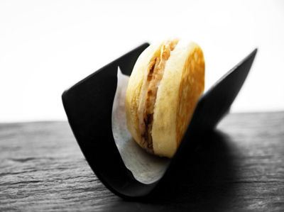 Pain cuit à la vapeur comme en Asie, farcis avec un mélange de pancetta et de porc cuits à basse température, de morceaux de mozzarella, un peu de moutarde, et puis il est grillé.