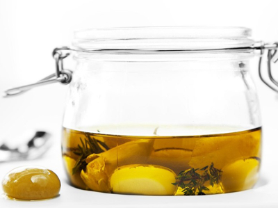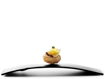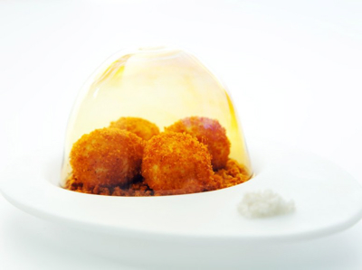 Technique créée à El Bulli en 2001, des sphères d’huile d’olive et jus d‘olive sont marinées avec de l’ail sauté légèrement doré, du thym, du romarin, du citron et des zestes d’oranges. La saveur et la préparation sont tout à fait naturels, Il rappelle des olives marinées.