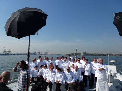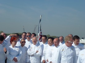 L’ensemble des chefs se met en place pour la photo de l’évènement organisé par le magazine Paris Match. Une photo pas facile à réaliser et qui a pris pas loin d’une heure. Il fallait que Manhattan soit pile poil à l’arrière des chefs… pas question de truquer !