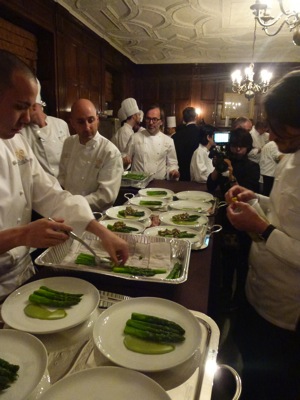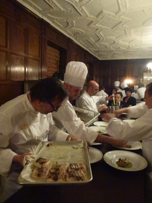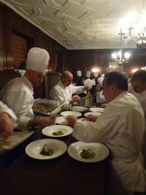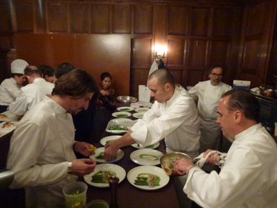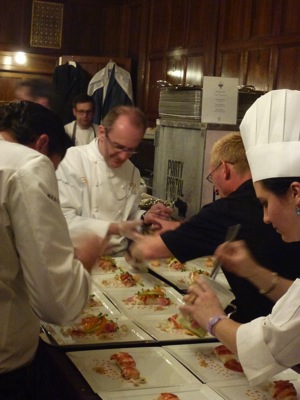 Le chef Jean-Georges, entouré de son équipe, dresse les plats qui, au fur et à mesure, partent dans l’immense salle pour rejoindre les trois tables de dix personnes, c’est l’effervescence en cuisine… 45 grands chefs qui produisent le même dîner, le traiteur qui gère la soirée avoue n’avoir jamais connu ça.