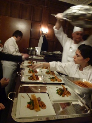 20h30, le premier plat est lancé, les discours terminés, l’apéritif bouclé, tous les participants on regagné leurs places. En cuisine, tout s’active, une armée de cuisiniers, de chefs, de maîtres d’hôtel entrent dans le ballet.