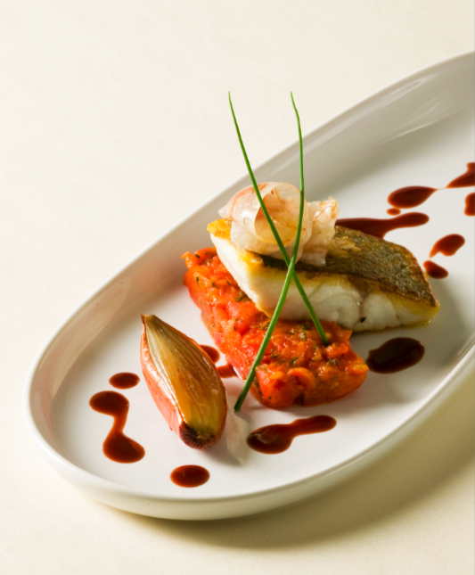 Saisissez les pavés de loup côté peau à l’huile d’olive dans une poêle antiadhésive bien chaude pendant 3 minutes. Terminez la cuisson dans un four préalablement chauffé à 180 °C (th. 6) 2 minutes selon l’épaisseur. Réchauffez les garnitures. Dressez sur des assiettes chaudes la concassée de tomates au centre à l’aide d’un rectangle et les échalotes confites. Posez délicatement les pavés de loup ainsi que le lard tiédi au four. Terminez par un cordon de sauce et deux brins de ciboulette.