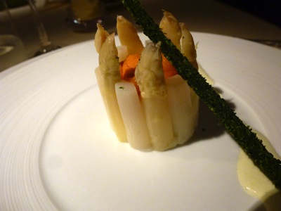 Mousseline d’asperges blanches façon charlotte aux oursins.