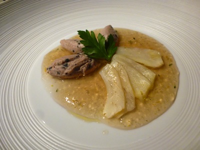 Quenelles de lapereau et son foie, avec artichaut et gelée d’agrumes.