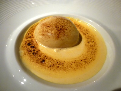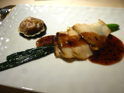 Fine tranche d’ormeau, ravioli de cèpes, épinards sauvages.