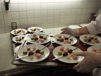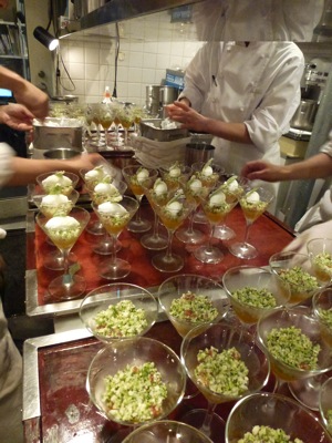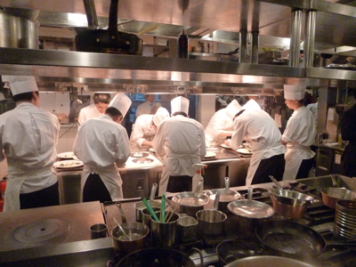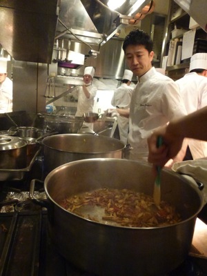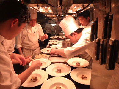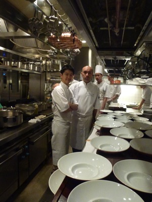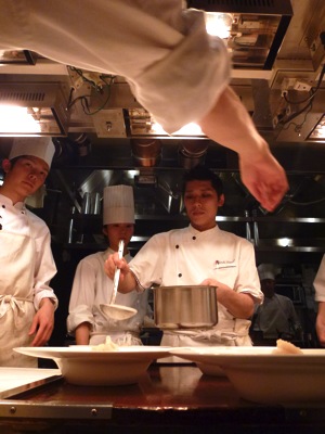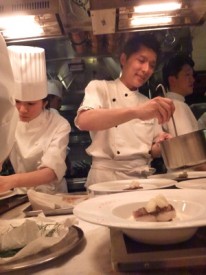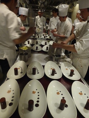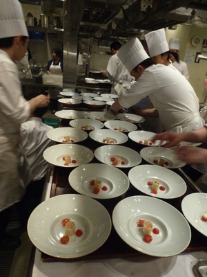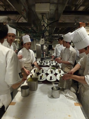 Tout s’active en cuisine, les amuses bouches partent déjà, et le premier plat se dresse, le public japonais aime dîner tôt et ne traîne pas à table, en général avant 22h le service est fini, il ne faut donc pas tarder pour faire suivre les plats.