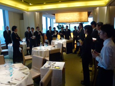 Dès 18 heures toutes les équipes de service du restaurant sot à pieds d’oeuvre pour le briefing, pas moins d’une trentaine d’équipiers, maitres d’hôtel, sommeliers, chefs de rangs sont à l’écoute du chef qui leur explique le menu et différentes manipulations qui doivent exécuter pendant le service.