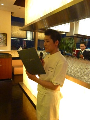 Dans quelques mois le chef Kotaro Hasegawa quittera le restaurant des frères Pourcel pour prendre des responsabilités plus importantes dans la ville de Osaka où le groupe Hiramatsu développe plusieurs restaurants dont le chef sera responsable. C’est ainsi que le remplaçant à la tête des cuisines du restaurant des jumeaux Takeshi Kamoda à pour la première fois été présenté au public, c’est lui qui a commenté le menu qui sera servi ce soir.