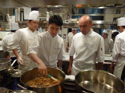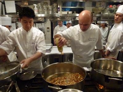 Dernière petite touche d’assaisonnement et de finitions par les chefs Kotaro Hasegawa et Laurent Pourcel.