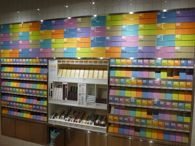 Tout un mur de bac de chocolat à l’entrée pour vous accueillir.