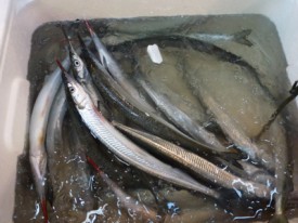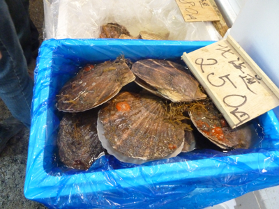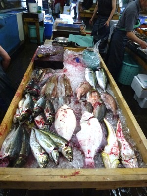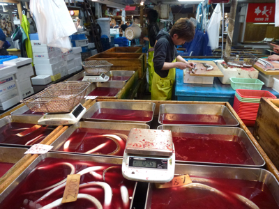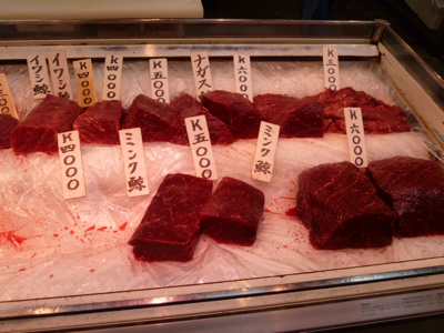 Le petits artisans poissonniers y présentent leurs produits, souvent vivant d’ailleurs, chacune des échoppe à sa spécialité, le thon bien sur, les crustacés, les crevettes vivantes, les coquillages, les poissons secs, les poissons découpés… et même la chair de baleine.