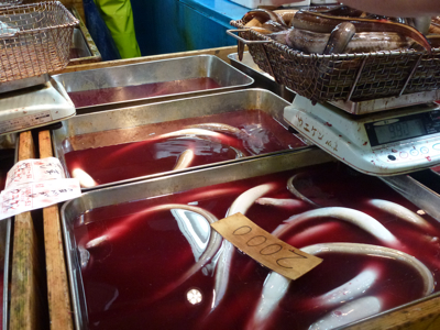Ci dessus un des marchands qui traite les anguilles, un mets très prisé au Japon.