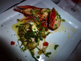 Nous y sommes allés un soir pendant le festival de Cannes. Bien entendu, il faut réserver à l’avance, car le restaurant affiche toujours complet et d’ailleurs, même en réservant à l’avance, vous n’êtes jamais sûrs d’avoir une table, c’est une des particularités de cette table.