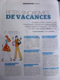 Mesdames, si vous désirez être » trendy » tout l’été, suivez le guide… vous » enfilerez une jupe de plage transparente « , vous » aurez une copine qui crée des bijoux « , vous » servirez du poulet impeccablement rôti dans des dîners improvisés « , vous » fréquenterez assidûment la terrasse du palais de Tokyo « , vous » sortirez le soir les mains dans les poches « , vous » boirez du Spritz à l’apéritif « …