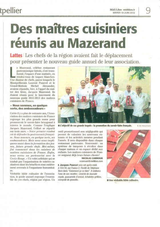 Le restaurant gastronomique Le Mazerand, à Lattes, a réuni ce mardi 19 juin, une dizaine de chefs de la région pour présenter la version 2012-2013 du guide annuel. Le chef Laurent Pourcel était présent pour valider l’objectif commun de tous : la promotion du savoir-faire français.