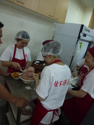Dès l’entrée, sur un côté du restaurant, quelques petites mains s’activent pour fabriquer les petits raviolis. La pâte est étalée au fur et à mesure des commandes des clients et les raviolis pliés en quelques gestes précis et efficaces. Sur le mur, un tableau où défilent des plaquettes rouges qui indiquent les préparations du jour disponibles.