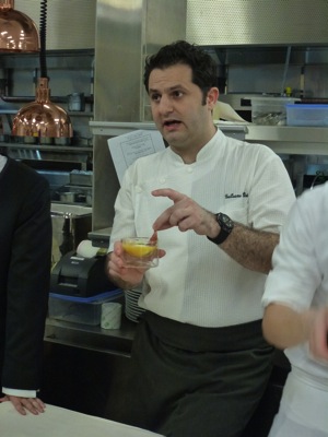 Explication du menu à toutes les équipes par le chef Guillaume Galliot, que ce soit en salle ou en cuisine, l’ensemble des équipiers du chef sont concentrés sur l’explication des plats. Ce soir, personne n’a droit à l’erreur, des grands chefs de la région seront à table, de même que des gastronomes avertis.