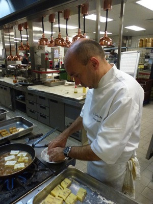 Le chef Laurent Pourcel est déjà depuis le matin aux préparations, asperges de Provence, noix de Saint-Jacques du Japon, et bœuf Waguy d’Australie au programme.
