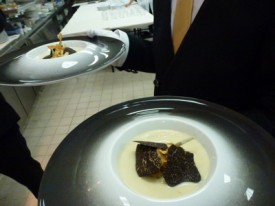 Le service a démarré, tout le monde s’active en cuisine, les émulsions garnissent les assiettes, les truffes se râpent au moment, les équipes de salle dans un ballet incessant posent, transportent les préparations des chefs vers les clients.