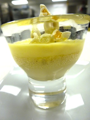 Gelée chaude de foie gras, soupe de maïs, pop corn et truffe.