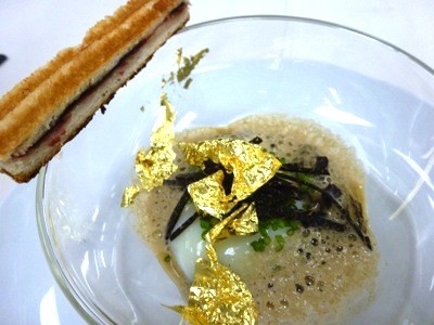 Œuf basse température, vin jaune et morilles, panini truffes, par Guillaume Galliot.