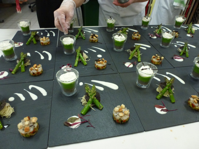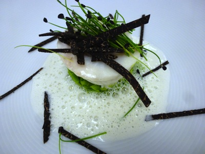 Trio d’asperges et noix de Saint-Jacques aux truffes, pour débuter le dîner, par les frères Pourcel.