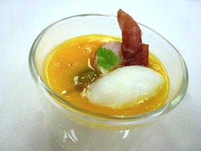 Gaspacho de melon, sorbet Muscat, homard bleu et pata negra pour commencer.