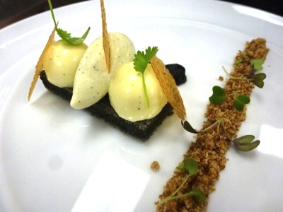 Parfait à la vanille, biscuit sésame noir et sucre crumble pour terminer.