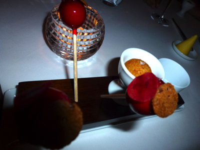 Lolipop de foie gras et betteraves. Croquette coulante.