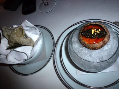 Oursin d’Hokkaido, caviar, chou-fleur et chips d’algues.