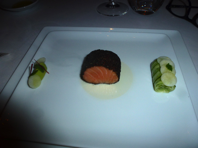 Saumon de Tasmanie fumé minute et pané à l’encre de seiche, purée d’avocat et concombre/curry.