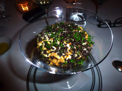 Oeuf confit, sabayon de truffe noire de Tasmanie, peau de poulet croustillante.