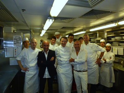 Les chefs Pourcel avec au centre le Chef Richard Ekkebus et une partie de son équipe de cuisine, dans les cuisine de Amber à Hong Kong.