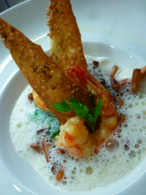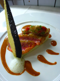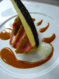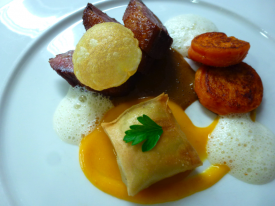 blinis de patates douces, croustillant de foie gras au coulis d’abricot,