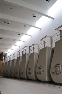 Il y a 52 cuves modernes et blanches, 52 parce qu’elles correspondent à une sélection parcellaire précise. Les cuves sont faites de béton, les murs sont en moucharabieh, ce qui permet une ventilation naturelle. L’éclairage est sobre, tamisé parce qu’il ne cherche pas d’affichage ou de jouer de décoration, le vin doit se reposer…