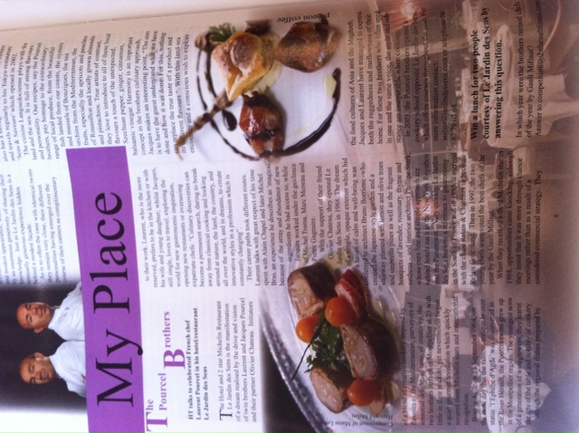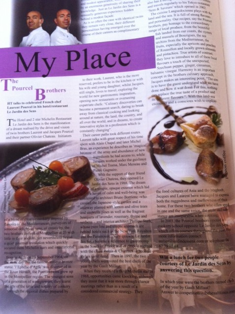 Le magasine « Hérault Time » destinés aux anglophones qui visitent le Département de l’Hérault, où à ceux qui vivent en terre languedocienne, consacre une page entière aux frères Pourcel et à leur table gastronomique » Le Jardin des Sens » sous le titre » My pLace « .
