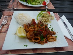 Copieux, ils sont très finement travaillés à la plancha, poivrons grillés, ail et persillade, jus succulent, servis avec du riz basmati et une petite salade de pousses de soja et fenouil. Un régal !