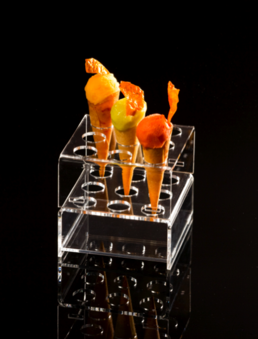 Sorbet de tomate multicolore, caviar de courgette à la menthe en cornet