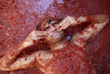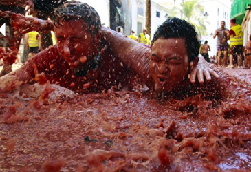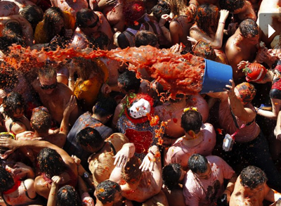Ensuite, le village de Buñol se transforme en une sorte de soupe à la tomate où tout le monde baigne dedans. Les rues deviennent rouges et dans un grand délire les batailles de tomates commencent.