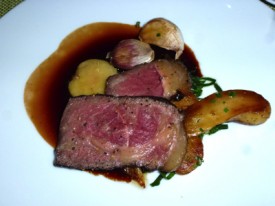 Sur le gril : Emincé de côte de bœuf de Bavière, accompagné d’une sauce vigneronne, pommes rate du Touquet, côtes de blettes au cumin et à l’orange.