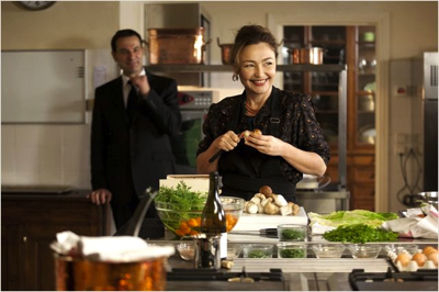 Avec Catherine Frot et Jean d’Ormesson, c’est la cuisine qui tient le rôle principal dans Les Saveurs du Palais. Il a fallu donc qu’un grand soin soit apporté aux plats qui défilent à la table du président. L’équipe du film s’est entourée d’experts en la matière, à côté du décor de la cuisine, nous avons donc installé une brigade de trois personnes dans une vraie cuisine : Gérard Besson, ancien chef étoilé, Guy Leguay, un autre ancien chef étoilé du Ritz, et Elisabeth Scotto, styliste culinaire bien connue, qui collabore au journal Elle. Toute cette équipe a donc concocté des plats esthétiques mais surtout comestibles, il fallait que l’assiette soit présentée devant les acteurs, pas d’objets factices, que du naturel.