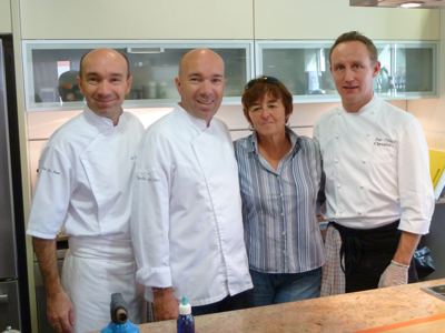 Laurent & Jacques Pourcel et Jean-Christian Chevalier, le chef pâtissier du Jardin des Sens entourant l’institutrice Madame Barthas.