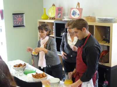 Alice et romain de l’équipe de l’Atelier de cuisine distribuent jus d’orange et fruits pressés… Mathilde n’en croit pas ses yeux, Papa et Tonton on fait venir toute sa classe pour cette matinée du goût !