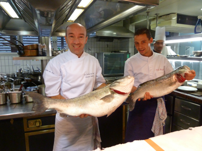 Yeux brillants, ouïes rouges vifs, écailles brillantes, chair raide, la fraîcheur ne trompe pas, ces deux pièces de loup de Méditerranée se sont négociées à 30 euros le kilo. La qualité n’a pas de prix dans les cuisines des frères Pourcel. Les chefs Nicolas Faujanet (ci-dessus) et Laurent Pourcel (ci-dessous) exhibent ces deux loups avant que les filets soient retirés et que, dès le dîner, ils puissent commencer à être servis aux clients.